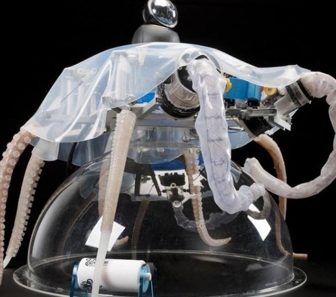 圣安娜高等研究院的教授Cecilia Laschi是软体机器人这一新兴领域的领军者。她打造了一种机器八爪鱼,能够像八爪鱼一样在水中和海床上移动。它能够把水吸入体腔,通过喷出水流在水中移动,还可利用柔软的触手在不平坦的海底攀爬。