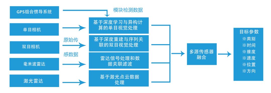 无人驾驶多传感器融合解决方案采用单线或多线激光雷达+摄像头+毫米波雷达对车周围的道路环境进行检测,实现多传感器功能互补;通过多传感器数据融合算法处理提取出道路的车道线信息、障碍物属性以及障碍物运行状态信息,综合分析给出预警信息提醒驾驶员对车辆做出相应的控制,保证车辆安全行驶。