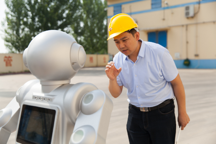 5月25日,山东省高青县国家粮食储备库工作人员与机器人在对话。