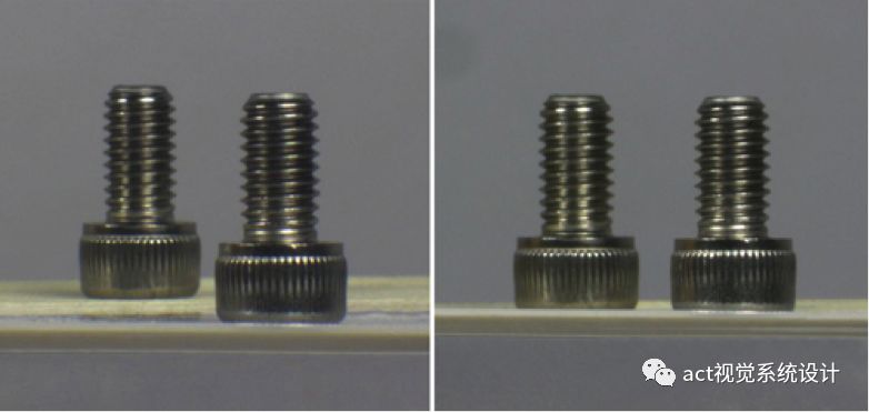 图2:左图为使用传统镜头成像,这幅图像将导致不正确的高度测量;右图是使用双远心镜头成像的,图像大小相同,能实现精确测量。