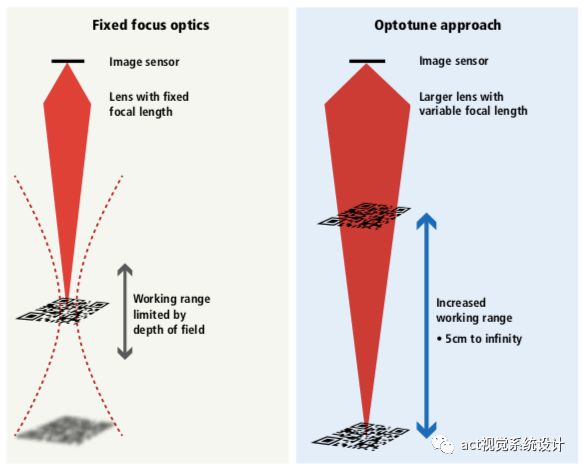 虽然传统镜头可以用来对距离相机不同距离的物体成像,但是如果高度不同的物体出现在成像系统中,镜头将需要重新聚焦。虽然可以在自动化生产线上进行手动调焦,但这需要针对不同的焦距重新设置相机。手动调节一方面会需要调节时间,导致停机时间增加;另一方面,若相机和镜头安装在设备上难以达到的区域,那么手动调节工作也会非常困难。
