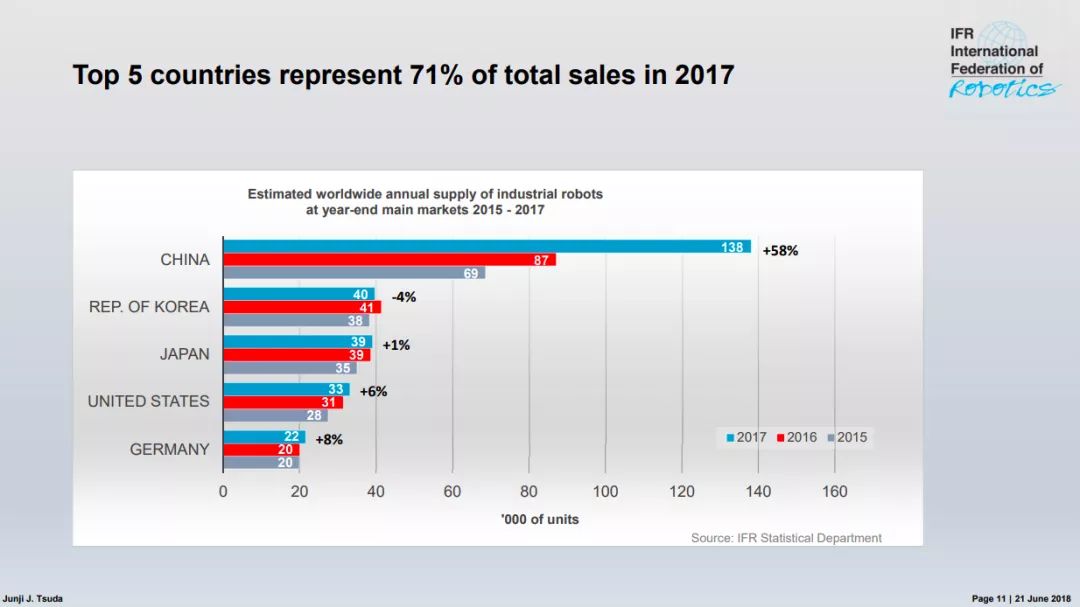 同样热情拥抱工业机器人的韩国和日本,以 4 万台和 3.8 万台排行第二、三名。而在欧美地区,工业机器人销售状况最好的是美国(3.3 万)和德国(2.2 万)。 这 5 个国家占了 2017 年工业机器人总销量的 71%。