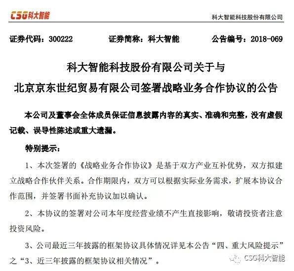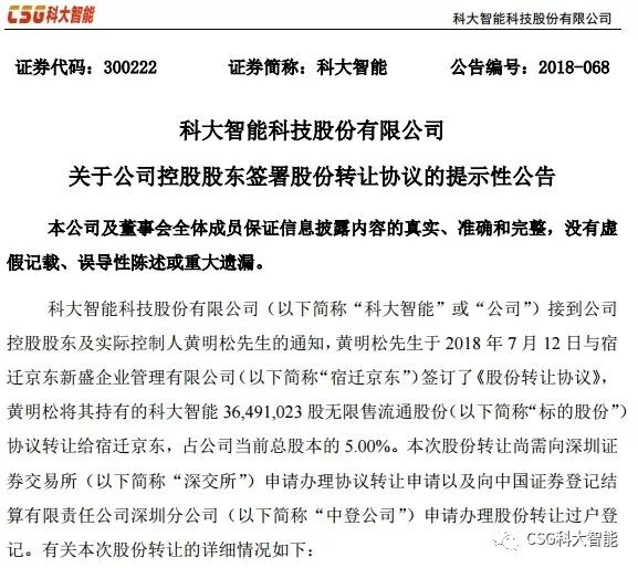 2018年7月12日,CSG科大智能董事长及实控人黄明松先生与宿迁京东新盛企业管理有限公司签订了《股份转让协议》,并将其持有的5%科大智能股份协议转让给宿迁京东,转让总价达6.18亿元人民币。