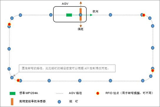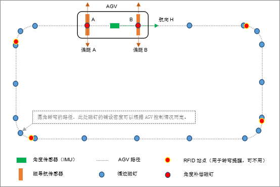 陀螺仪输出的角速度因性能差异而存在不同程度的漂移误差或者噪声,其误差和噪声也是随时间而积累的。尤其是考虑成本的情况下采用高性价比的陀螺仪,因此陀螺仪带来的角度误差在AGV整个的运行周期内不可能忽略的,否则AGV可能因为角度误差跑偏出轨而无法到达下一个磁钉。所以AGV的整个运行周期内是需要不断对角度传感器进行补偿的。如何进行补偿呢?需要借助磁导航传感器的辅助,此时磁钉的铺设间距和磁导航传感器的安装位置需要特殊对应。具体如下图2所示: