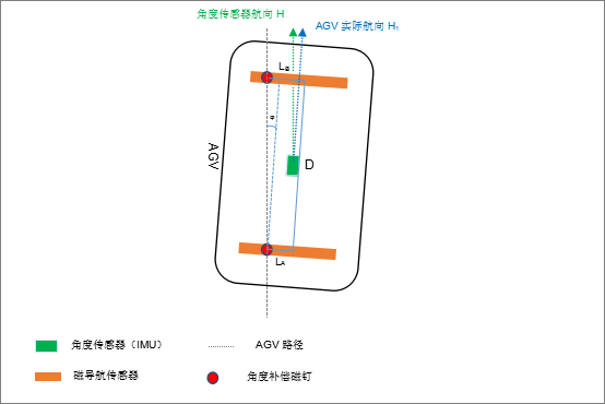 如上图所示,相比图1的导航方案,图2的方案增加了1个高精度磁导航传感器。同时路径上铺设的磁钉不单单用于AGV循迹,多了对角度传感器补偿的功能。具有角度补偿功能的磁钉铺设间距必须与磁导航传感器的安装间距大致相同,也就是说当AGV经过这种磁钉时,磁导航传感器A和B分别同时位于磁钉A和B的磁场上方。此时若AGV小车实际的航向角度为H1,角度传感器输出的航向角为H,磁导航传感器A在磁钉A的输出偏距是LA,磁导航传感器B在磁钉B的输出偏距是LB,如下图3所示: