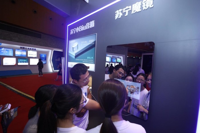 (苏宁展区工作人员正在介绍黑科技产品 “魔镜”)