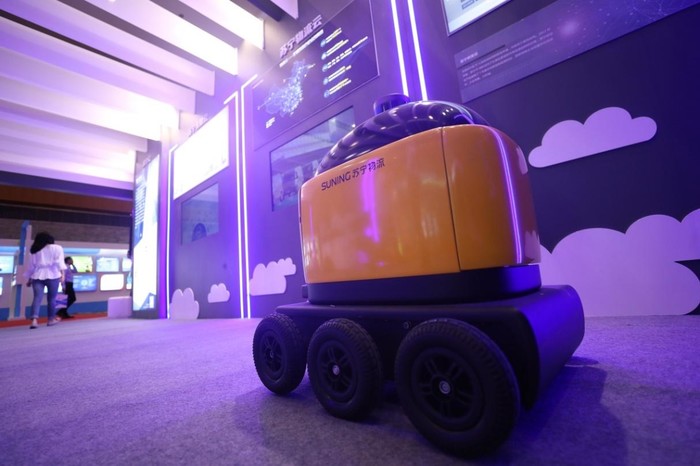 (江苏互联网大会上苏宁展示的无人小车“卧龙一号”)