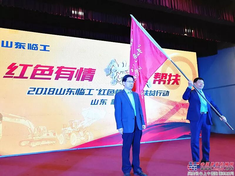 山东临工党委副书记周维升同志向精准扶贫沂蒙山分队队长、山东纳百川工程机械贸易有限公司董事长刘加欣授予山东临工“红色情”精准扶贫沂蒙山分队队旗。扶贫旗帜的飘扬标志着2018山东临工“红色情”精准扶贫活动临沂站活动正式开启!