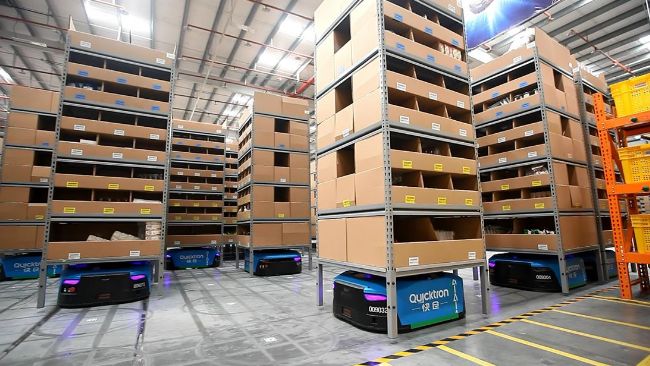 这些智能机器人可以自动收捡包裹—有的可以自己赶到货架指定区拣货;有的自己去找到订单箱装货,然后把它们送到仓库的另一端,最后由快递公司去取件。这个过程带来了大量的时间节省。