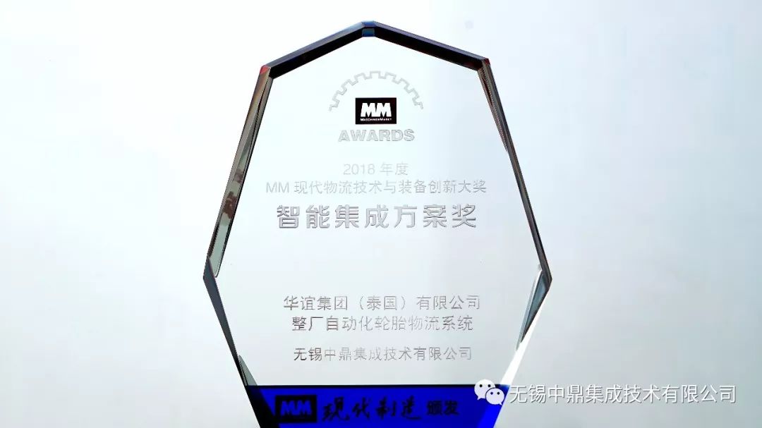 展会期间,在2018年度中国物流智能集成方案评选活动中,中鼎集成的华谊集团(泰国)有限公司整厂自动化轮胎物流系统荣获“2018年度 MM 现代物流技术与装备创新大奖-智能集成方案奖”。