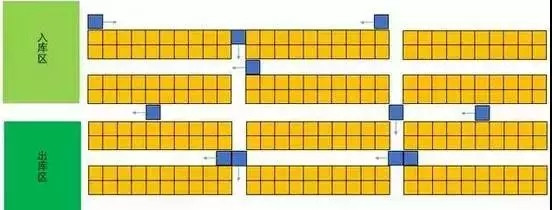 不同的货架摆放方式也会直接影响到拣选机器人的效率,本文使用下图所示的摆放方式进行设计。该方法对于其他路网模型的兼容性较高,研究成果扩展性较强,同时该模型可以最大化仓储空间,也是物流车辆和仓储快速对接的一种最大化空间利用模型。