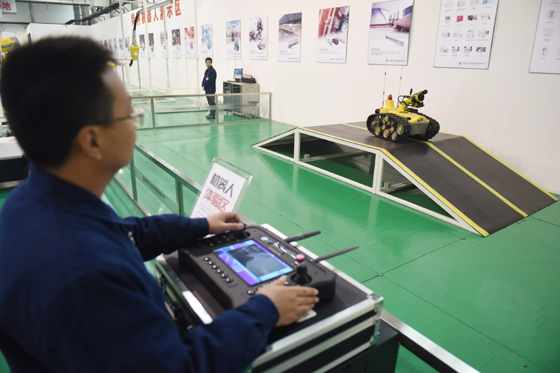 12月22日,工作人员操作展示一台消防灭火机器人。