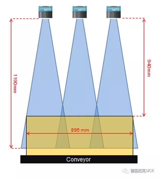 例如:对于0.3mm分辨率的条码(条码长度40mm,条码高度7mm),在景深要求为250mm时,可仅通过3个相机覆盖达约900mm的阅读宽度