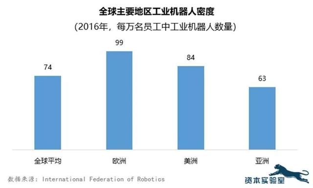 据国际机器人联合会发布的最新数据显示,2016年,全球工业机器人平均密度达到每万名员工中拥有74台机器人,比2015年的66台,增加了8台。从区域分布来看,欧洲机器人密度最高,达到99台,美洲为84台,亚洲为63台。