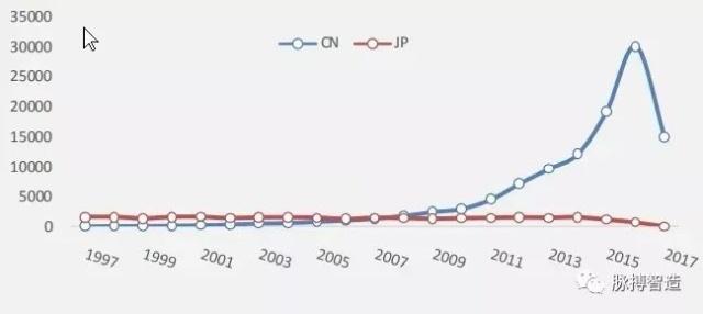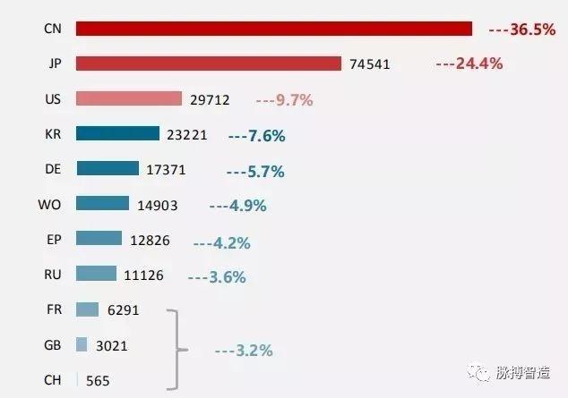 从时间跨度上来看,中国在2006年前后的专利申请量超过日本,居世界首位。
