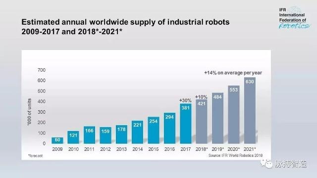 根据IFR数据,2018年全球范围内工业机器人出货量将达到 42.1 万台,2021年预计可达 63 万台,年增长率为14%。