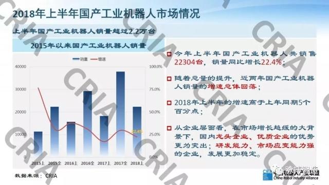 2018年以来国产工业机器人销量继续增长,上半年累计销售 22304台,比上年增长 22.4%,销售总体保持了相对平稳的增长。