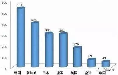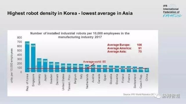 韩国是全球工业机器人占有率最高的国家,超过全球平均数(85台/万名员工)的 8 倍。