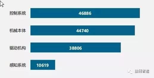 在中国工业机器人专利技术的构成方面,机械本体、控制系统申请量最多,驱动机构排第三,感知系统的专利布局量最少。