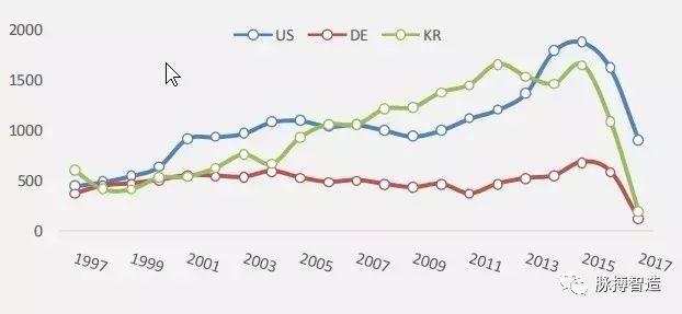 但2017年韩国工业机器人出货量下降4%,为 39732 台。