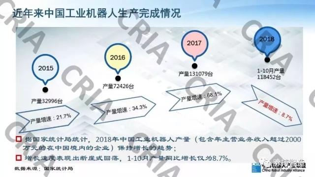 据国家统计局统计,2018年中国工业机器人产量(包含年主营业务收入超过2000万元的在中国境内的企业)保持增长的趋势,增长速度表现出现断崖式回落,1-10月产量 118452 台,同比增长仅为 8.7%。