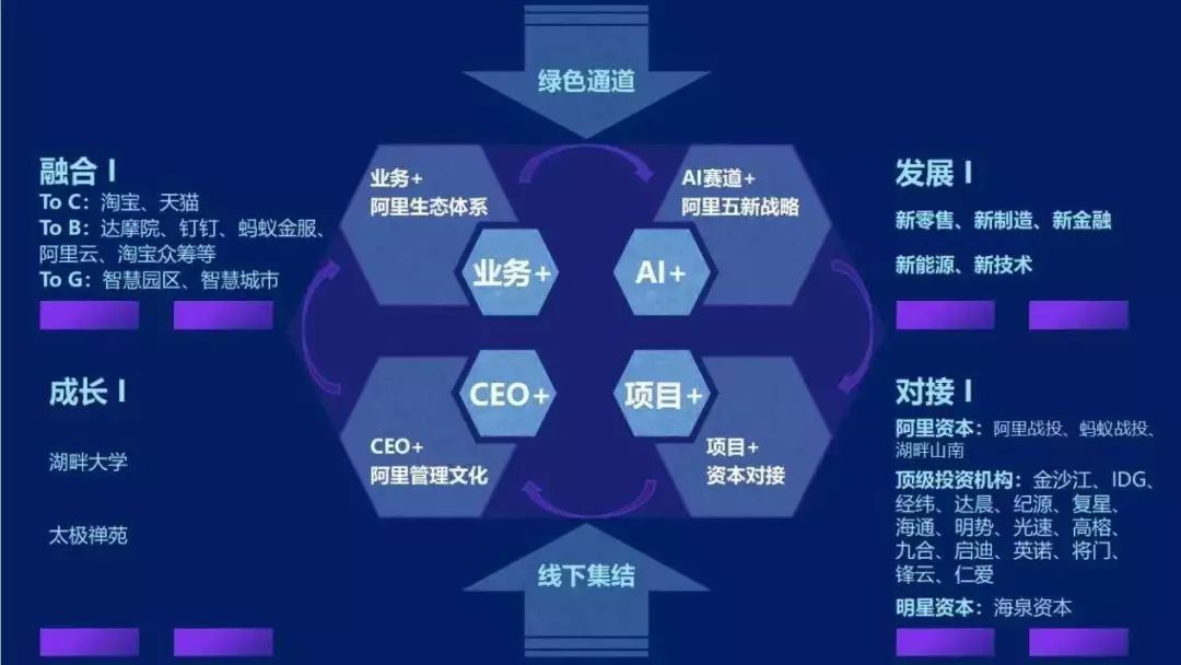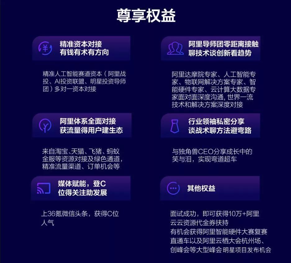 AI赛道明星班将原本散落在阿里各个BU及阿里外部生态的能力和力量开放出来,建立起一个生态链接组织和效能提升平台。这里有阿里AI投资联盟、知名投资机构、阿里研究院、阿里云、太极禅苑、达摩院,帮助创业者对接资本,解读技术趋势;有淘宝、天猫、飞猪、蚂蚁金服、钉钉等庞大的流量资源供创业者优先享受;还有独角兽CEO前来分享经验教训;顺利入选“AI赛道明星班”的创业团队还将有机会获得36氪微信头条的独家宣传报道。