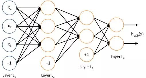 下图中的x1、x2、x3等表示输入值,构成第一层L1,组成输入层;中间的圆形成L2、 L3 、L4等多个层次,组成隐层;神经元经过多层的调整、评估和分析计算处理后得出hw,b(x)的结果作为神经元的输出值,构成输出层,组成人们常说的人工神经网络。