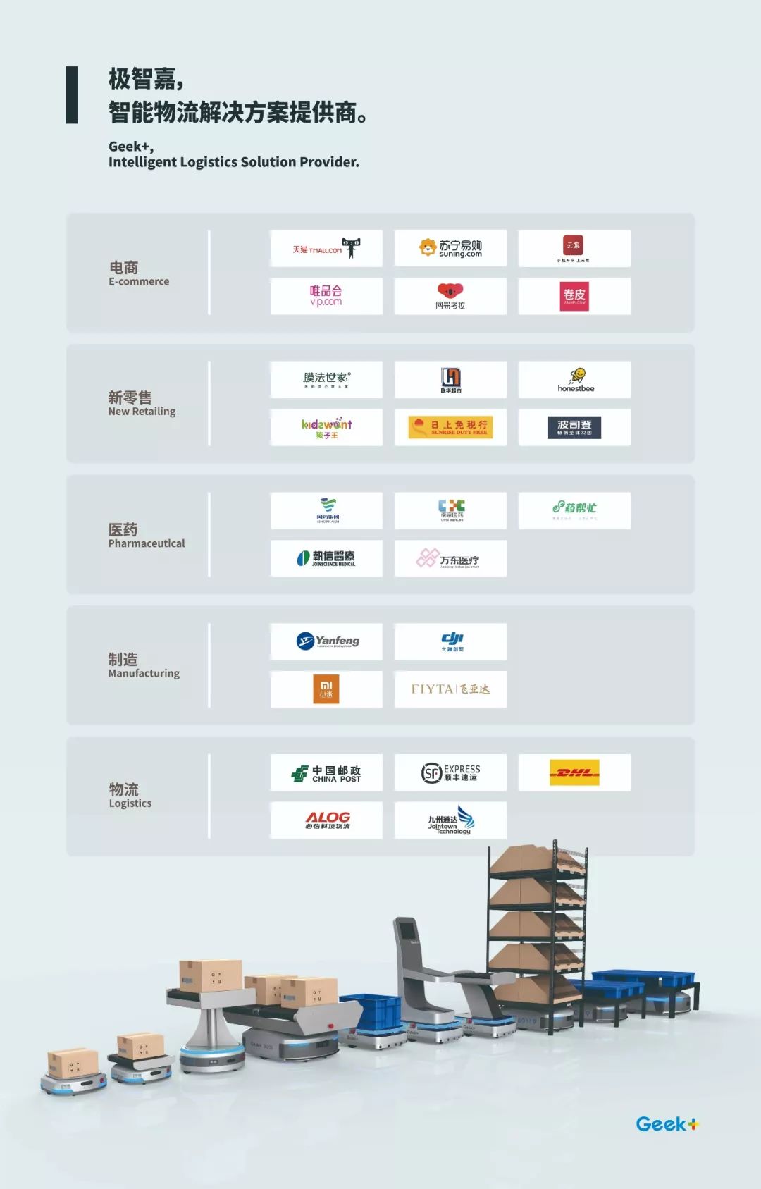 极智嘉科技 (Geek+) 是一家引领全球智慧物流变革的智能机器人企业,全球AMR市场份额位居世界第一*。极智嘉提供全品类物流机器人产品和解决方案,助力企业实现物流智能化转型升级。目前,极智嘉已在全球部署超10,000台AMR机器人,服务耐克、迪卡侬、沃尔玛、丰田、西门子等全球超300家全球大客户,商业落地规模领先业界。