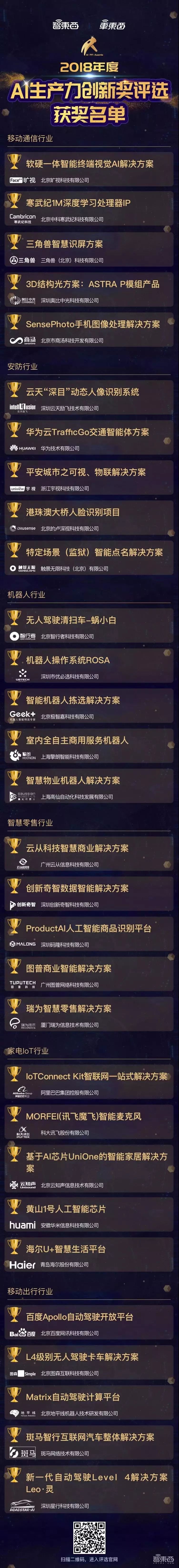 在移动通信行业,AI芯片带动边缘算力革命,结构光等视觉技术让交互更自然。在安防行业,人脸识别技术不仅覆盖到从城市到各类特定场景,而且从端到云都在全面技术升级。在机器人行业,我们看到机器人正在落地真正解决行业问题。在零售行业,新兴的AI全场景解决方案正在改变零售的形态和效率。在家电IoT行业,核心模块、芯片迎来中国式技术突围。在移动出行行业,自动驾驶中国军团势不可挡。