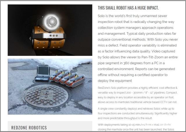 突破性拓宽机器人应用的广阔天地。机器人从实验室里从出来,走进商业领域更是它的使命。在研究和商业的十字路口,惠特克老先生一手巩固卡耐基梅隆大学在机器人领域中的研究高度。一手成立了机器人科技公司Redzone robotic,推出专门检查和修理下水道和水管的机器人,解决人类不适合清理直径为26 到 41 厘米的下水管道的问题。