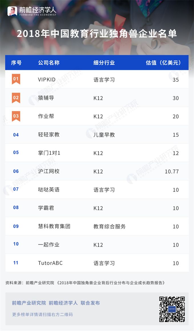 11家教育行业独角兽企业中,有6家是K12教育领域的,占据过半份额;其余分别是语言学习(3家)、儿童早教(1家)、教育综合服务(1家),K12教育发展势头较强。