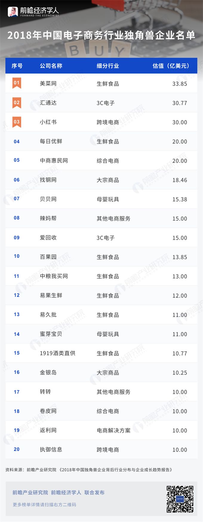 2018年,电子商务行业独角兽企业数量上榜20家,估值规模为320亿美元。从企业平均估值水平看,平均单个独角兽估值为16.02亿美元,远低于全部独角兽平均单个企业估值46.28亿美元。去掉估值最高的美莱网后,平均单个独角兽估值下降至15.08亿美元。