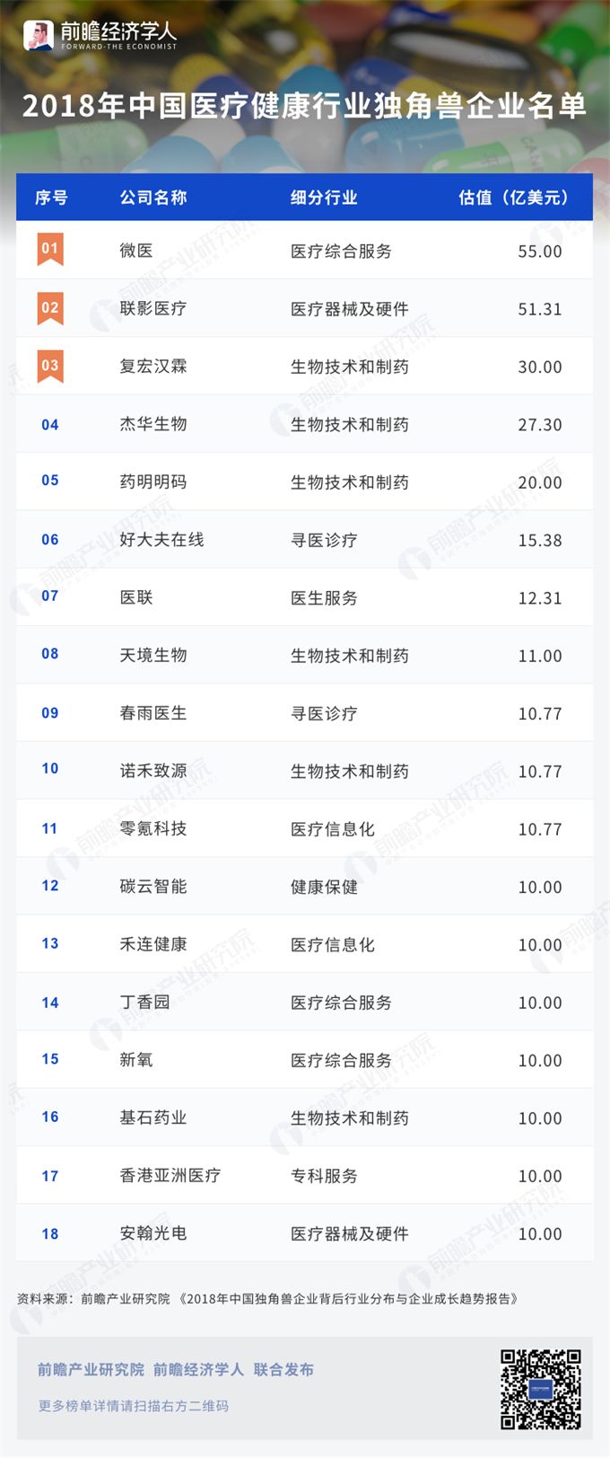2018年,医疗健康行业独角兽企业数量上榜19家,估值规模为325亿美元。从企业平均估值水平看,平均单个独角兽估值为18.03亿美元,远低于全部独角兽平均单个企业估值46.28亿美元。去掉估值最高的微医后,平均单个独角兽估值下降至15.86亿美元。