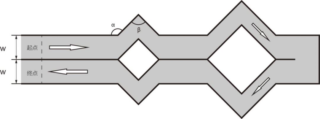 赛道总长度在50m~100m之间,赛道宽度w在2m~3m之间,赛道是由横幅或其他材质围挡起来,围挡的赛道高度在30cm~50cm。赛道由多处折弯,其中赛道α角的范围在120°~160°,β角的范围在90°~130°,具体如图1所示: