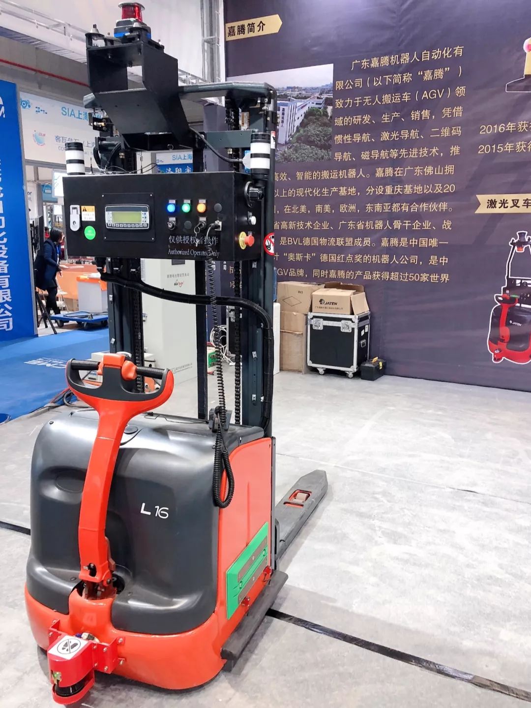 随着智能工厂对于物流自动化要求的不断提升,对于激光叉车的需求与日俱增。嘉腾本次展会也带了嘉腾热销的激光叉车参展,很多国内外知名客户都已在使用该款叉车。