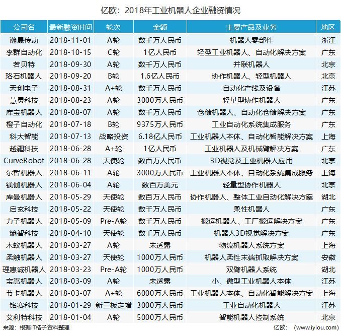 在可统计的范围内,2018年获得过融资的工业机器人相关企业共有24家,总融资额超过15亿人民币。