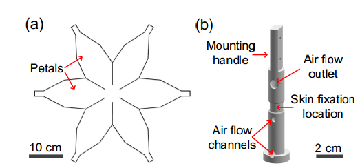 该团队开发的抓取器呈空心的圆锥状,它包含了三个部分,一个由3D打印制作的、16根硅橡胶制的骨架,一个用于夹持的连接器,以及外面的轻质表皮。