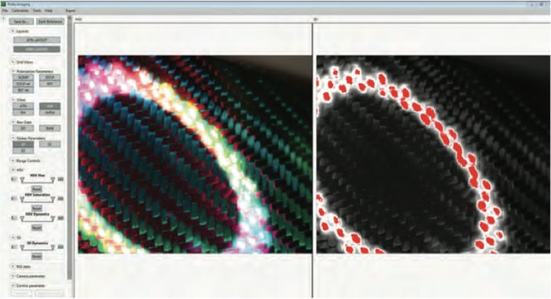 图1:偏振相机用于检测图像的光滑和弯曲表面,图中表明这些区域的测量可能无效,包括强度图像(右)和假彩色偏振(左)。