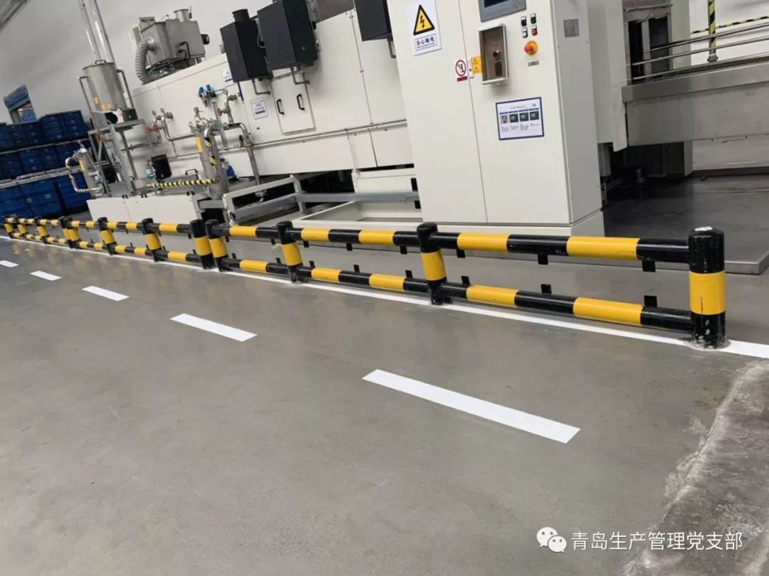 为提高作业的安全性和改善现场的目视化,物流区域也利用改造时间进行了防撞栏的安装和地面划线工作。防撞栏可以将叉车作业区域与人行区域分开,达到人车分流的作用,保障设备设施和人员安全。