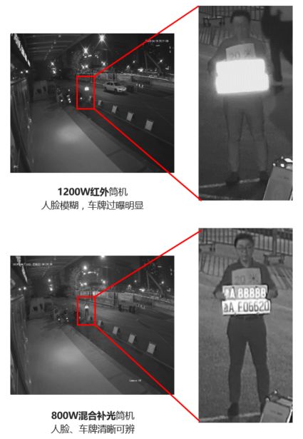白天,网点门口的高清摄像机已经可以达到要求,而到了晚上却有点“心有余而力不足”。普通红外补光基本可以满足夜间常规人脸监控要求, 但看车牌容易过曝。