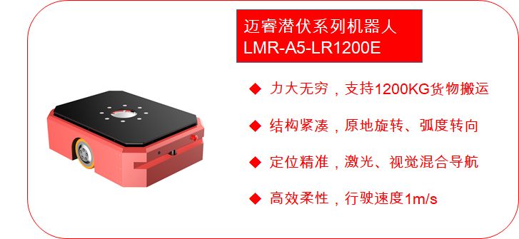 新款迈睿潜伏机器人LMR-A5-LR1200E以其雄壮身姿,背负货箱弧度穿行。基于客户切实需求而研发,LMR-A5-LR1200E可背负1200KG货物,弧度转向,激光和视觉混合导航,适应更多应用场景,提升作业效率;能够广泛应用于传统制造业、食品及汽车零部件制造等重型行业。