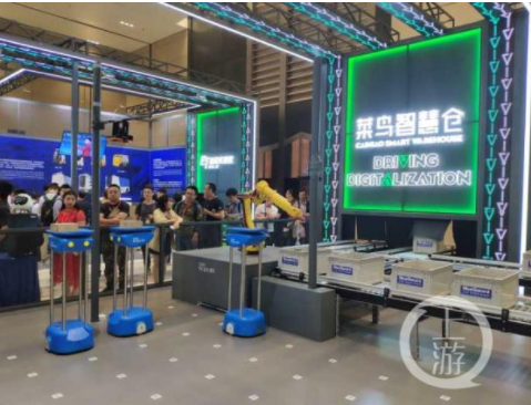 展会现场,占地面积最大的菜鸟全链路无人操作的智慧仓格外吸引眼球。整个智慧仓的流程一览无余,商品自动存储在立体仓库,发货时由算法调度出仓,机械臂将商品搬运交接给机器人,机器人完成运输,实现物流仓库的全无人化操作。据悉,这个智慧仓已经在嘉兴、黄陂等多个菜鸟物流仓库实现。