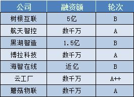 2019年上半年,黑湖智造、海智在线、云工厂、博拉科技、树根互联、蘑菇物联、航天智控7家企业获得融资。