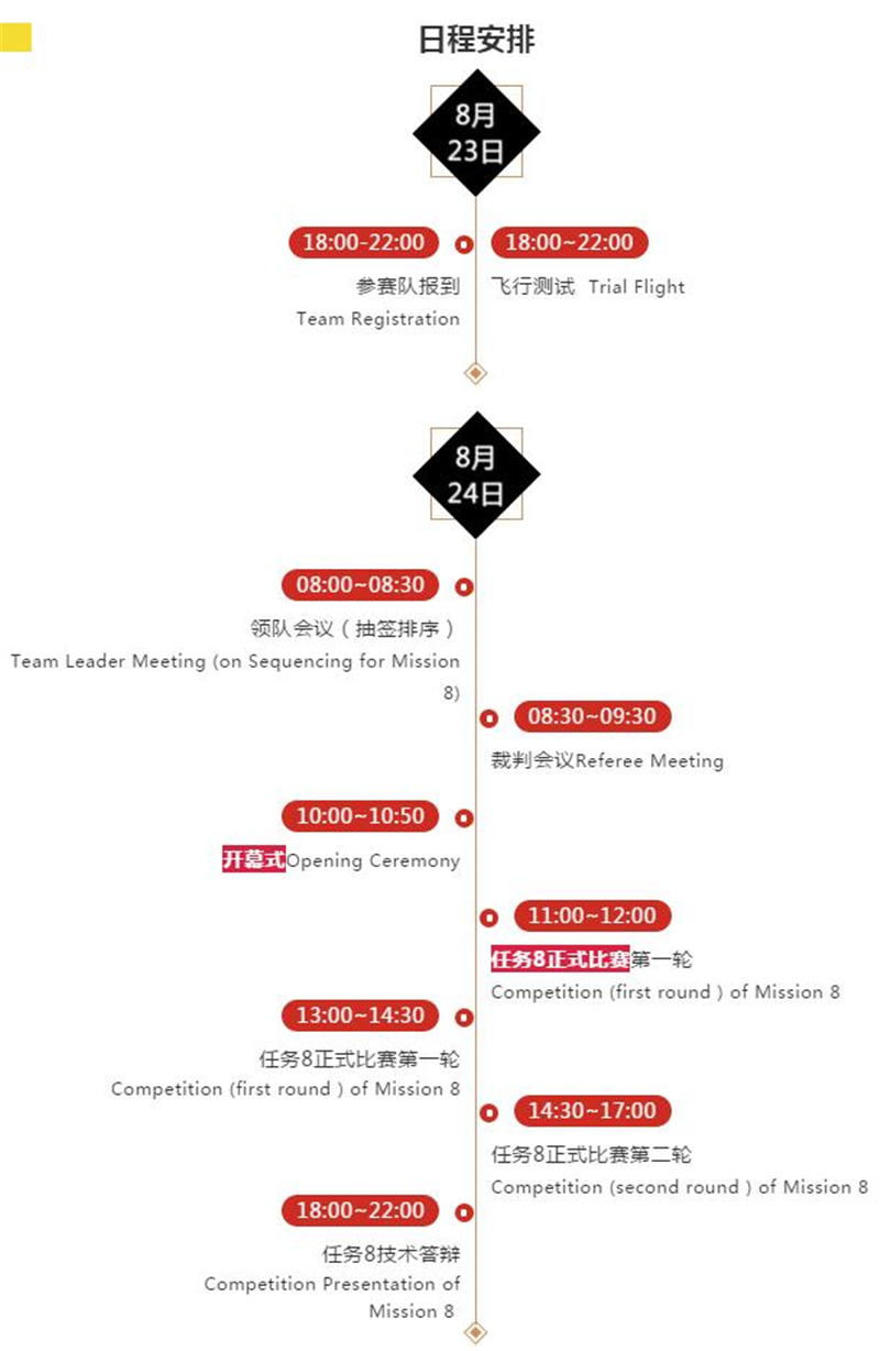 第八代任务“星际飞船救援行动”由王英勋教授与Robert教授共同设计。第八代任务中,将首次进行人与机器的远程非电子手段交互,由4个空中机器人协助人完成由一个人不可能独立完成的任务,这标志着无人系统智能化技术迈上了新台阶。2019年是第八代任务的第二年,赛事将进一步升级,无人系统、人工智能将得到发挥与展示。
