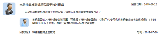 有网友于7月25日在国家市场监督管理总局网站公众留言系统咨询电动托盘堆高机是否属于特种设备,7月30日,市场监管总局特种设备安全监察局给予了答复。