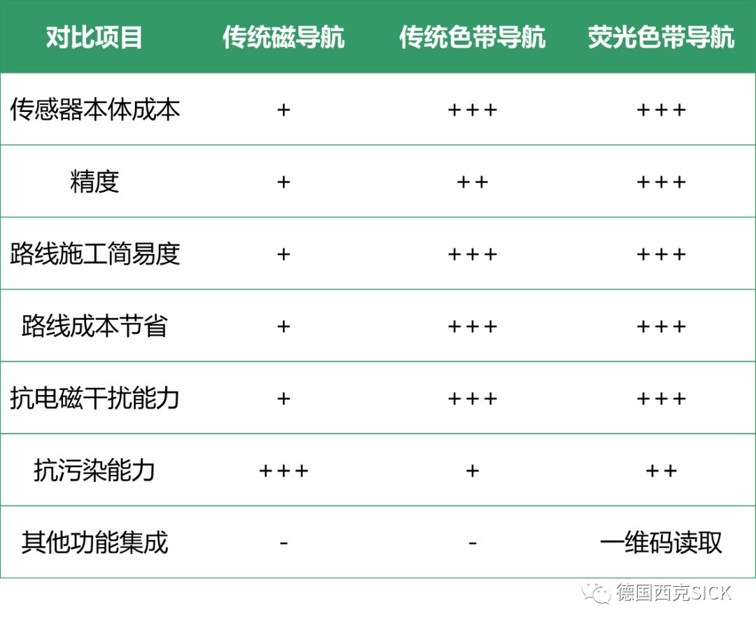 与国内AGV路线导航主流的磁导航方式相比,荧光导航传感器本体成本略高,但能在一定程度上消减整体方案成本,并解决传统磁导航方案的技术瓶颈。小编在此总结其优势有如下几点: