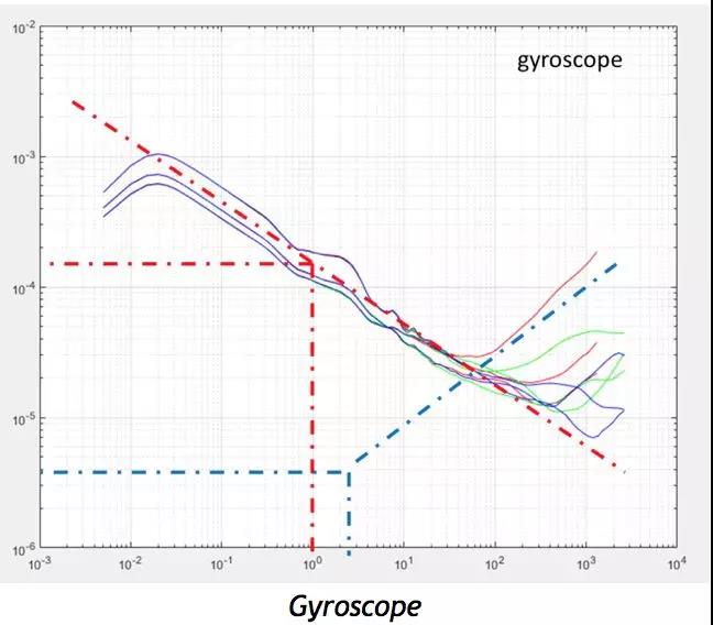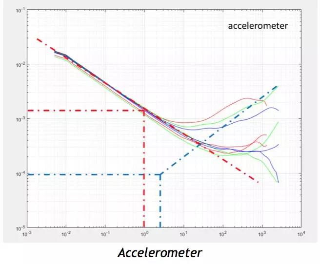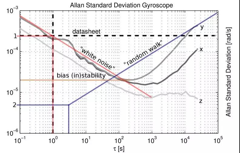 参考Kalibr的wiki说明, 得知可以通过Allan standard deviation来分析imu的噪声性能.方法是将imu静置并采集数据,一般要求一个小时以上,然后用这些数据进行分析.Kalibr上提供的示例图如下: