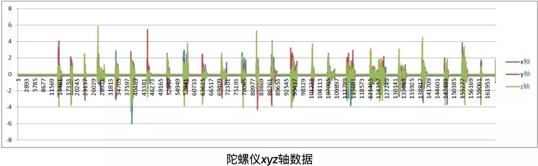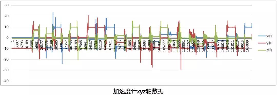 如流程所示, 需要在采集IMU的时候将IMU不停翻面并静置, 因此我们按此方法使用小觅相机采集了3组数据,同样设置了PROC_IMU_TEMP_DRIFT以避免温漂问题. 由于算法需要加速度计的时间戳和陀螺仪的时间戳是完全一致的, 而小觅的相机加速度计和陀螺仪时间戳不是完全同步的, 因此我在采集的时候, 以陀螺仪时间戳为基础, 对加速度计数据进行了线性插值. 实现了两种数据的完全同步. 每组数据会有20~30次的翻面过程.下图是其中一组数据的值.