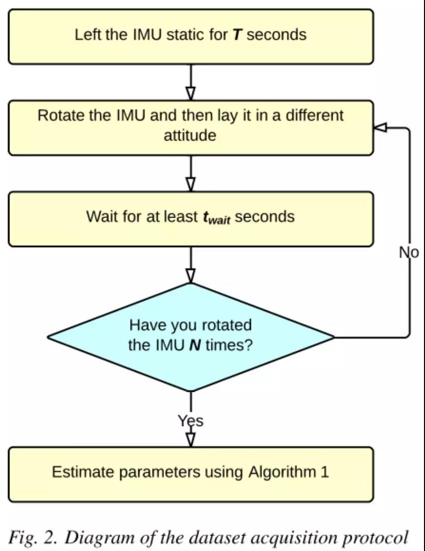 可以看出b为bias参数, T为misalignment参数, K为scale参数.从参数构成可以看出, IMU_TK的模型是以加速度计为初始, 认为加速度计的Z轴是标准的, 然后校正三个轴互相垂直, 然后再校正陀螺仪的三个轴对应加速度计的关系.标定流程如下图所示:
