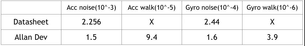 可以看出实地测量出来的数值与官方数据在量级上基本吻合, 但是偏小. Kalibr文档也建议,在应用这些参数时,需要人为把方差调大以防止过于详细imu数值.另外在gyro的结果图中的左上部分还观察到了上凸现象, 不知这是什么原因.